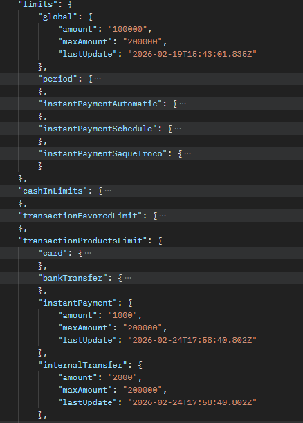 | ⚠️ Observações Importantes Pelo menos um campo interno de cada objeto (limits, transactionFavoredLimit, cashInLimits, etc.) deve ser fornecido na requisição para que o ajuste seja processado; |